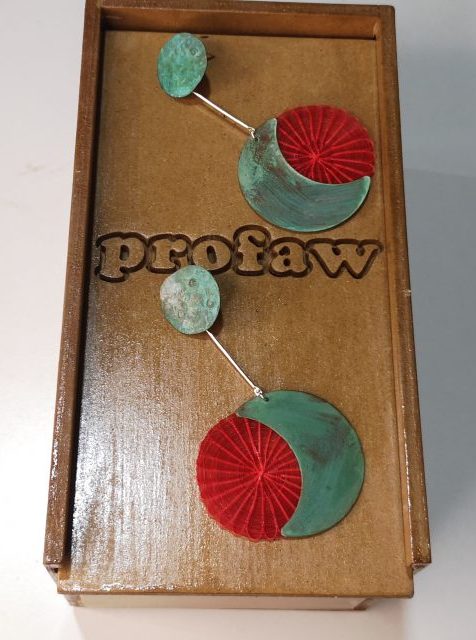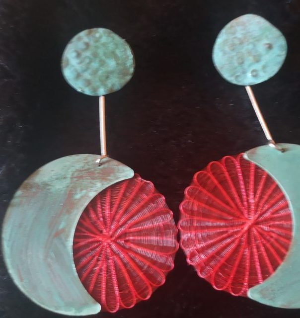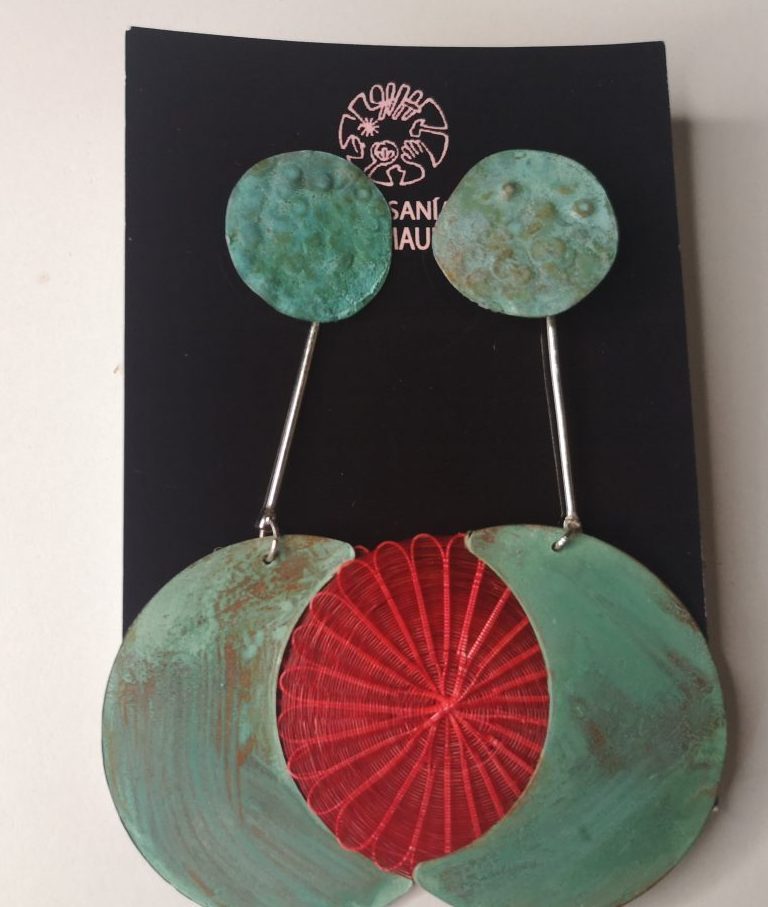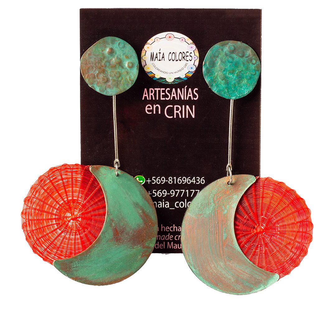 Colgantes diseño de media luna en cobre y crin. La forma circular en esta obra de artesanía se compone de crin tejido minuciosamente por manos de artesana, dando forma circular y su color rojo es pintado con anilina gatti vegetal producto hipoalergénico. La media luna se compone de cobre patinado es el nombre que se da, a la técnica de oxidación al cobre para dar este color verde agua el gancho es de plata.